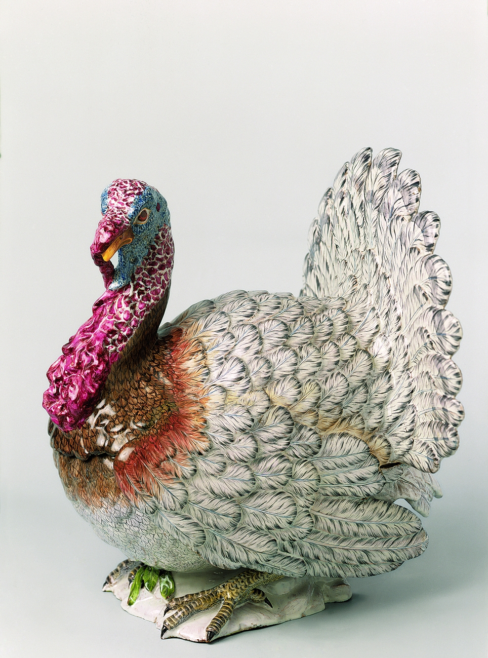 Zu den Highlights und Publikumslieblingen gehört der Truthahn. Auf den ersten Blick eine Tierplastik, als gelungene Nachbildung des „Gallus Indicus“, auf den zweiten Blick eine gebrauchsfähige Terrine, in der beim höfischen Festmahl Truthahnragout serviert werden konnte. Sie zeichnet sich durch ihre Größe, die lebendige Modellierung des Tieres und die exquisite Feinheit der Bemalung aus und gehört zu den spektakulärsten - und teuersten - Objekten, die die Manufaktur im Angebot hatte. Wegen ihrer Kostbarkeit hat man wahrscheinlich darauf verzichtet, sie in Gebrauch zu nehmen, zu groß war die Gefahr, dass sie beim Abspülen zerbrach. Aber als Mittelpunkt hatte sie den Ehrenplatz auf der Festtafel!
