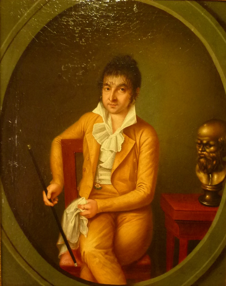 Mit seinen Ohrringen und Stirnlöckchen überbietet der junge Mann auf dem Porträt allerdings sogar die Mode-Exzentriker nach Art der Incroyables. Ohrringe wurden um 1800 mit Darstellungen männlicher Indigener verbunden, im Sprachgebrauch der Zeit ‚Wilde‘ oder ‚Indianer‘, die ihren sonst nackten Körper mit Gold schmückten. Der Porträtierte wählte also ein ausgesprochenes exotisches Accessoire. Auf dem Bild verbinden sich auf diese Weise Mode-Bewusstsein, Körperlichkeit, Exotik und philosophisches Gespräch zu einem vieldeutigen Spiel der Identitäten.