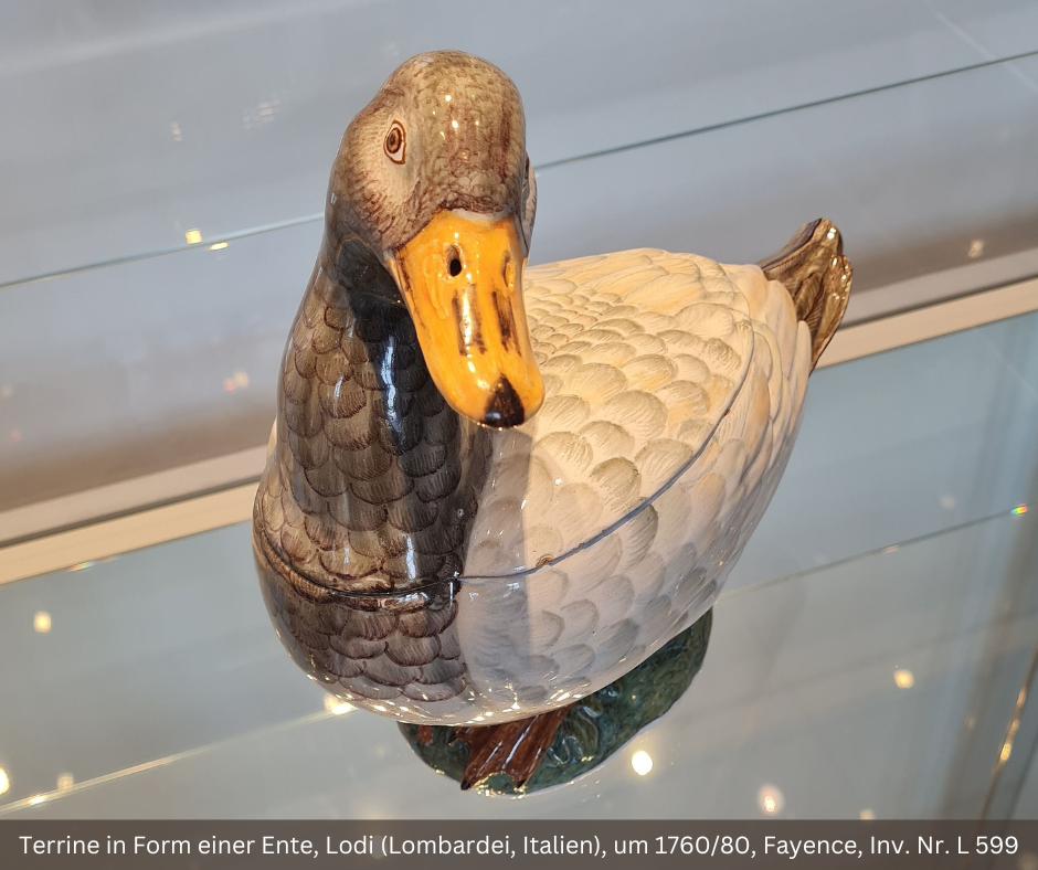 Die Terrine in Form einer Ente ist eine Weiterentwicklung der 'verkleideten' Speisen, die aus der Renaissance stammen. Damals schmückten Köche Geflügel nach der Zubereitung mit Federn, um den Eindruck zu erwecken, das Tier sei noch lebendig. Im 18. Jahrhundert entstanden aus diesem Trend prächtige Geflügel-Terrinen. Die Ente ist ein funktionales Gefäß, das auch als plastische Dekoration dient. Man konnte darin Entenragout oder -pastete servieren und das Schöne mit dem Nützlichen verbinden.