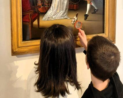 Die Klasse wird in Gruppen aufgeteilt, und jede Gruppe erhält einen Ausschnitt aus einem Porträt. Damit suchen die Kinder das vollständige Gemälde und überlegen, wer die dargestellte Person sein könnte. Anschließend erfinden sie eine kurze Biografie und erzählen ihre Geschichte den Mitschülerinnen und Mitschülern bei einem gemeinsamen Rundgang durch die Ausstellung.