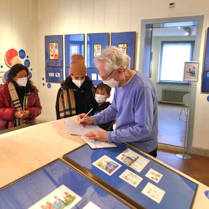 Einige Familien, die sich gerade die Ausstellung ansahen, bemerkten den zurückhaltenden Paul Maar und hatten so das Glück, mit ihm sprechen zu können und ein Autogramm zu erhalten.
