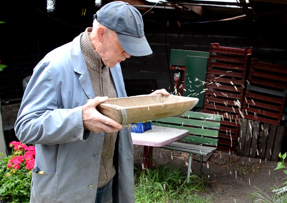 Die hölzerne Wanne aus dem Gärtner- und Häckermuseum gleicht einer simplen Teigmulde, ist aber eine sogenannte „Samenschüssel“, wie sie – selten – bis heute von Bamberger Gärtnern zur Reinigung selbstgezogenen Gemüsesamens verwendet wird: Einige Handvoll mit dem Sieb vorgereinigten Samens werden in die Schüssel gegeben, die mit beiden Händen leicht über die Längsachse geschwenkt und in die gleichzeitig hineingeblasen wird. So fliegen die leichten Rückstände der Samenkapseln hinaus und die schweren Samenkörner bleiben im Gefäß.