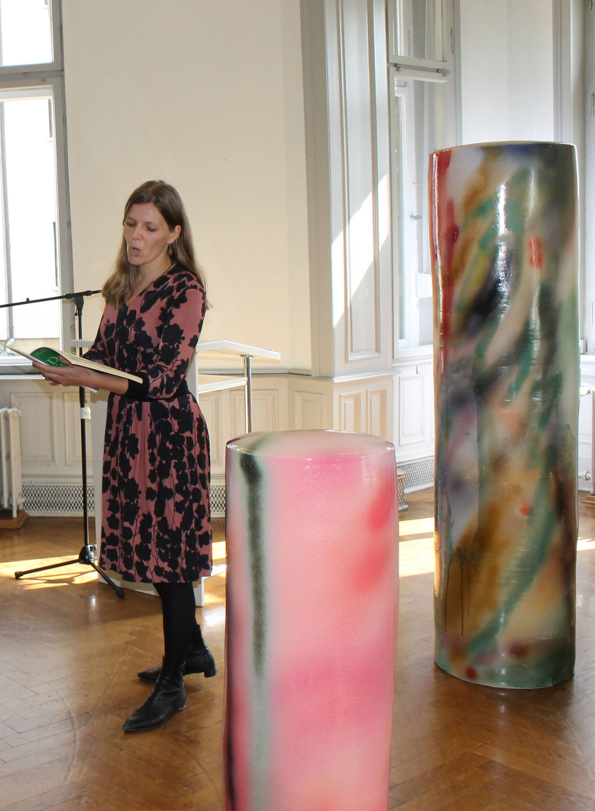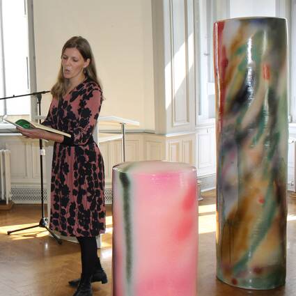 Dr. Regina Hanemann erinnerte an Gretel Hinniger, Begründerin dieses Bamberger Kunstpreises. Sie hatte zum Gedenken an ihren verstorbenen Sohn, den Bamberger Künstler Volker Hinniger, 1990 jene Stiftung ins Leben gerufen, die 2020 den begehrten Kunstpreis bereits zum zwölften Mal vergeben konnte. Dr. Barbara Kahle, Jurymitglied und Vorsitzende des Bamberger Kunstvereins gab eine ausführliche Einführung zu Stefanie Brehms künstlerischem Schaffen. Ihre Werke sind überwiegend in den Materialfeldern Keramik und Kunststoff verortet. Bei beiden Werkgruppen verbindet sich Skulptur mit Malerei. „Farbe und Skulptur sind Partner, gehen ein Bündnis ein auf der Basis intuitiven Verstehens von Form, Stoff und Bild.“ Bei den Keramiksäulen ergeben sich je nach Standpunkt unterschiedliche Bilder, die ineinander übergehen und im Umschreiten gelesen werden wollen. „Ganz wichtig ist natürlich das einfallende Licht, das die glasierte glatte Oberfläche reflektiert, so als wollte sie auf ihre spezifische Eigenart hinweisen. Sie müssen also unbedingt öfter in die Ausstellung kommen, um die Folgen des wechselnden Lichteinfalls wahrnehmen zu können!“ forderte Kahle das interessierte Publikum auf. „In den letzten Monaten der Pandemie war oft von Systemrelevanz der Kunst zu hören, von einer Kunst, in der unsere Gesellschaft ihre Werte problematisiert und aushandelt, wo Debatten angestoßen und Gewissheiten hinterfragt werden.“ Kultur mutiere dabei oftmals zu Gesellschaftspolitik, so Kahle weiter. „In erster Linie ist sie aber systemrelevant, weil sie Orte der Poesie schafft, der Phantasie, des Schönen. Lassen Sie sich in diesem Sinne von der Beschwingtheit und dem farbigen Rausch mittragen!“, lautete abschließend die Empfehlung von Frau Dr. Kahle an das Publikum.