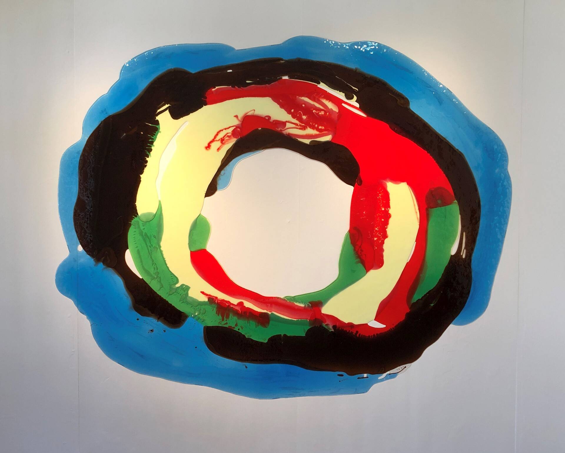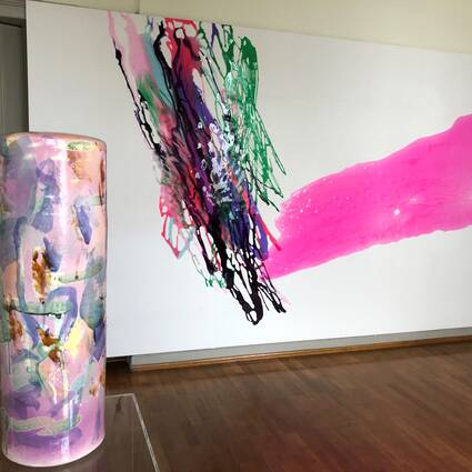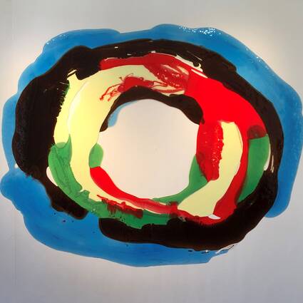 Farbe zur Geltung zu bringen und das in direkter Unmittelbarkeit, ist auch das Thema von Stefanie Brehms zweitem künstlerischen Feld: den großflächigen, reliefartigen Bildern aus Kunststoff (Polyurethan). „Diese Farbstücke brechen in kulturell tradierte Sichtweisen und kunsthistorisch festgelegte Gattungen ein, ohne aber ihre Beziehung zur abstrakten Malerei der Gegenwart wie zur Plastik gänzlich auf zu geben“, so Kahle weiter. „Es handelt sich um halbtransparente, für sich seiende flache Objekte in dynamisch kreisenden Formen oder Diagonalbewegungen, die im Glanz des Materials und den sich ineinander vermengenden Farbräumen eine besondere Aura entfalten. Stefanie Brehms Kreativität und Leichtigkeit im Umgang mit so unterschiedlichen Materialien wie der althergebrachten Keramik einerseits und neuen Werkstoffen wie dem Polyurethan, das mühelose Aufbrechen festgelegter Gattungsgrenzen hat die Jury überzeugt, sie für den Volker-Hinniger-Preis 2020 vorzuschlagen.“