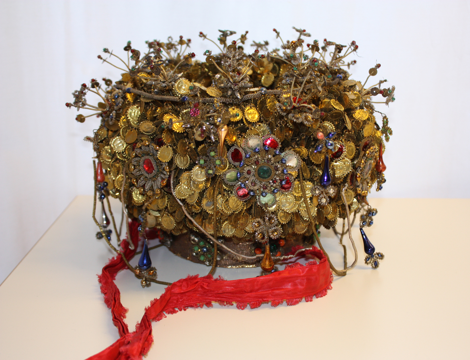 Der obere Bereich der Krone weist acht aufwendig gestaltete dreireihige Blüten aus den gleichen Materialien auf. Darüber befinden sich 16 aufgesteckte Sträuße aus Messingdraht und kleineren Glasperlen. Aus dem oberen Bereich der Krone fallen zudem acht abwechselnd golden und silbern gefärbte Drahtkordeln in den Stirnbereich herab. Der innen liegende Pappring ist mit weißem Stoff bezogen. An ihm sind auch zwei 50 cm lange rote Bänder angebracht. Die Brautkrone ist in einem sehr guten Zustand. Wahrscheinlich wurde in der zweiten Hälfte des 20. Jahrhundert eine „Restaurierung“ durchgeführt, da die Brautkrone Plastikperlen und Bänder aus Kunstfasern aufweist.