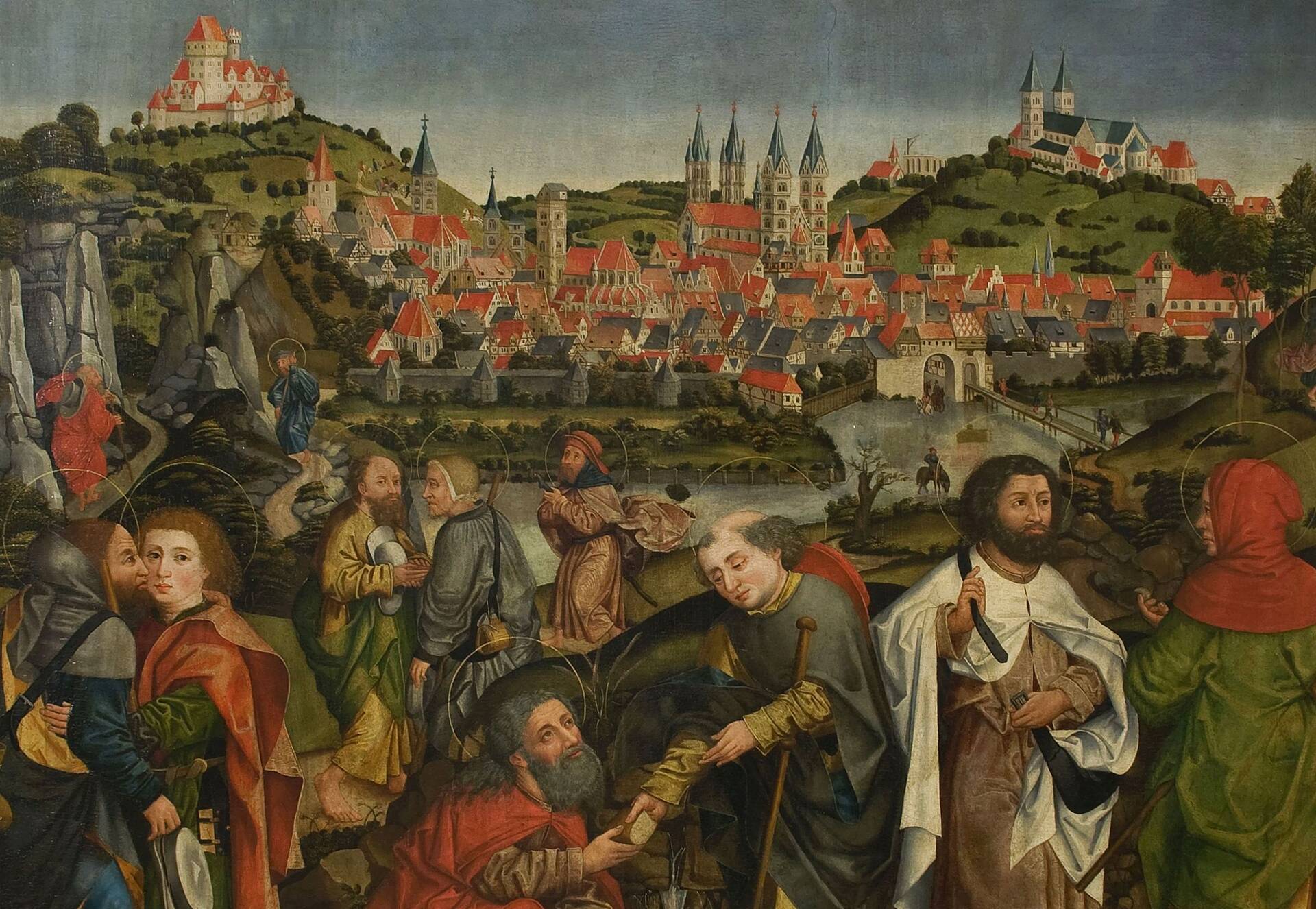 Außerdem zu sehen ist eines der Highlights des Historischen Museums: der Apostelabschied von Wolfgang Katzheimer d.Ä. bzw. seiner Werkstatt um 1483-87. Anstelle Jerusalems zeigt das Gemälde im Hintergrund eine der frühesten Ansichten Bambergs als Kulisse für den Auszug der Apostel, um in der Welt das Evangelium zu verkünden.