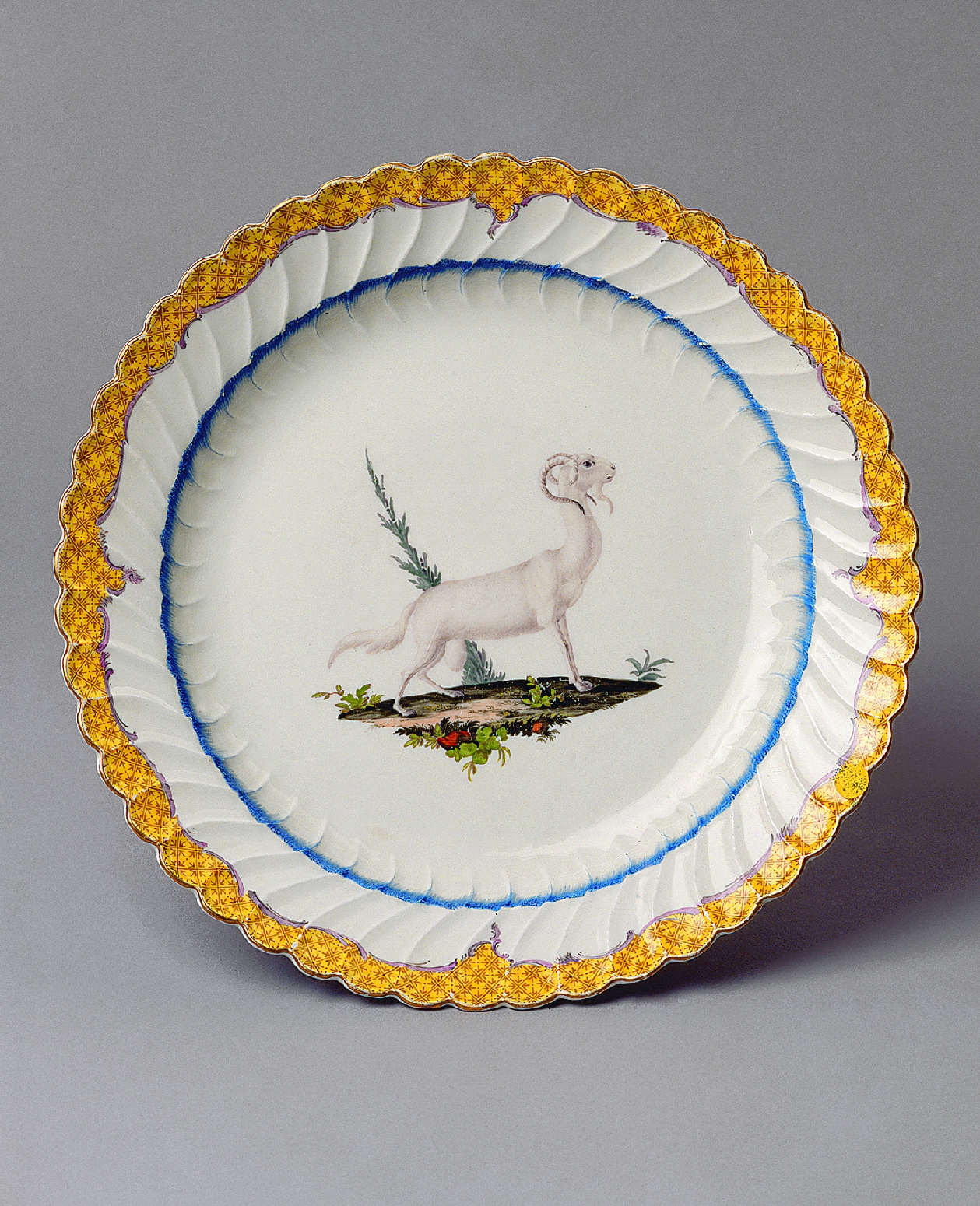 Einen ganz anderen Aspekt des großen Friedrich bietet ein gelb gerandeter Speiseteller in der Sammlung Ludwig. Dort ist nicht etwa er selbst abgebildet, sondern ein langgestrecktes, etwas merkwürdiges, ziegenbockartiges Fantasietier. Dieser Teller gehört zu den seltensten friderizianischen Meißenservicen, dem sogenannten Japanischen Service. Nur wenige Stücke befinden sich in öffentlichen Sammlungen.